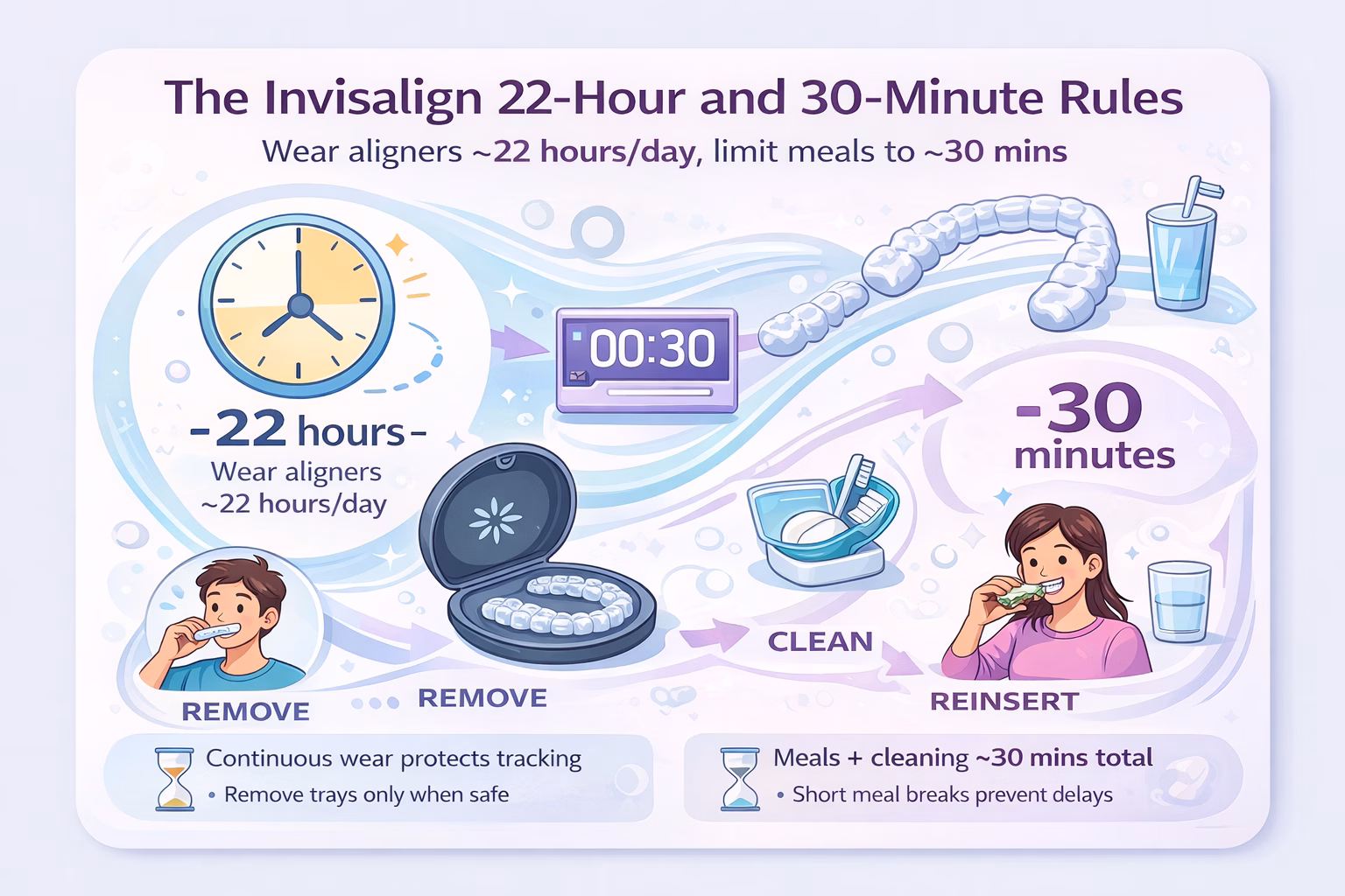 Invisalign rules explained: use the 22-hour rule Invisalign target and the 30-minute rule Invisalign habit to protect Invisalign wear time and reduce Invisalign tracking issues.